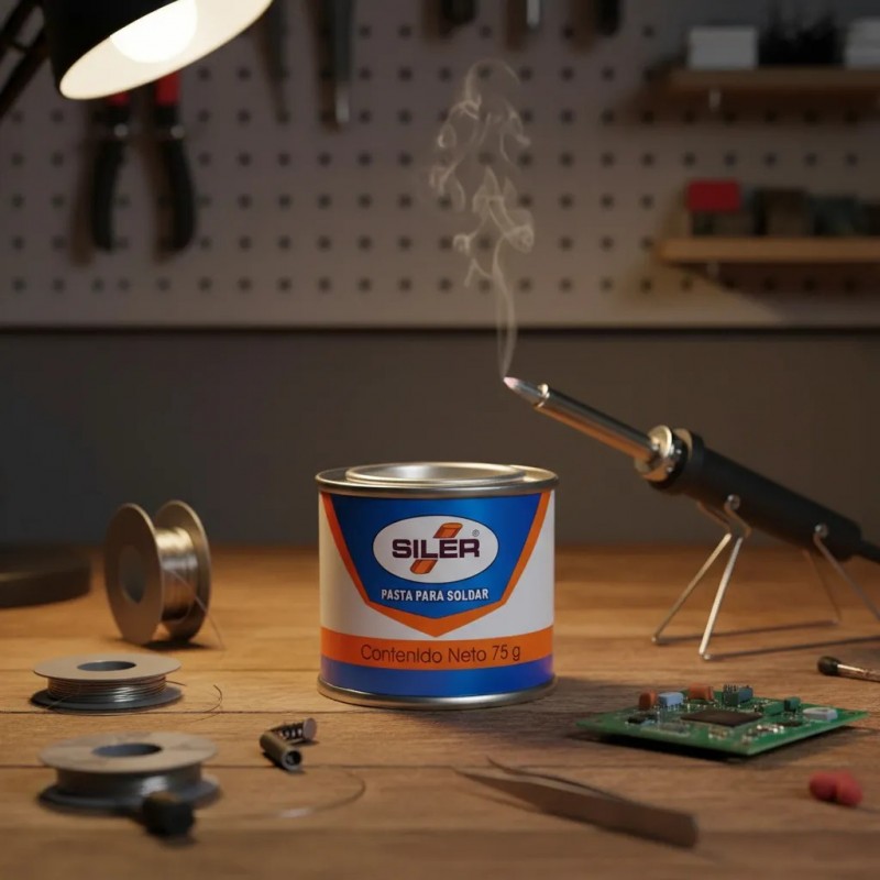 La pasta para soldar Siler es ideal para trabajos de soldadura electrónica y eléctrica, ya que mejora la humectación del estaño y facilita uniones limpias y firmes. Ayuda a eliminar óxidos durante el proceso de soldado, asegurando mejor conductividad y acabados profesionales.